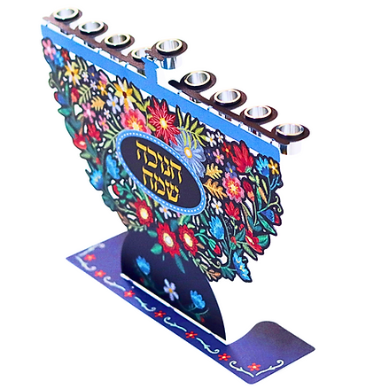 החנוכיה היפה שלנו משלבת מגוון צבעים ודוגמאות של פרחים שניראים רקומים צומחים ועולים מתוך הבסיס, תוך שמשאירים כמה פרחים נחים על הבסיס ובמרכזה הכיתוב "חג שמח"